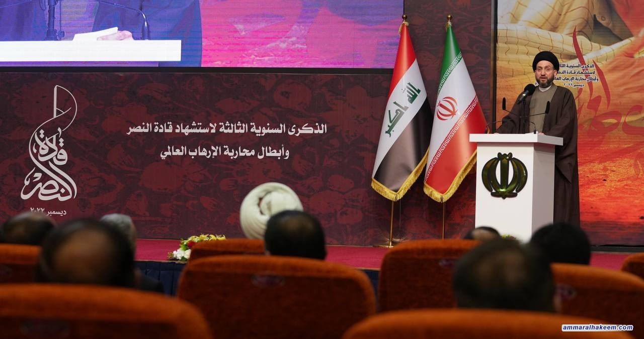 خلال الحفل التأبيني الذي أقامته سفارة الجمهورية الإسلامية الإيرانية في بغداد بذكرى استشهاد قادة النصر (رحمهما الله) 31/12/2022، أكد السيد عمار الحكيم رئيس تيار الحكمة الوطني أن الحديث عن الشهداء وما يمثلونه من قيمة وطنية وعقائدية وبطولية في نفوس شعوبهم ومجتمعاتهم مهمة مركبة وصعبة جدا، تعجز معها الكلمات عن وصف التضحية التي يقدم عليها الشهيد بأغلى ما يملكه دفاعا عن دينه وعرضه وأرضه و وطنه.