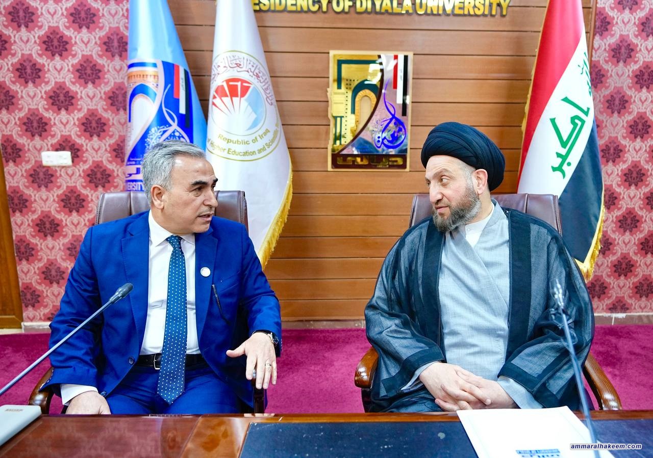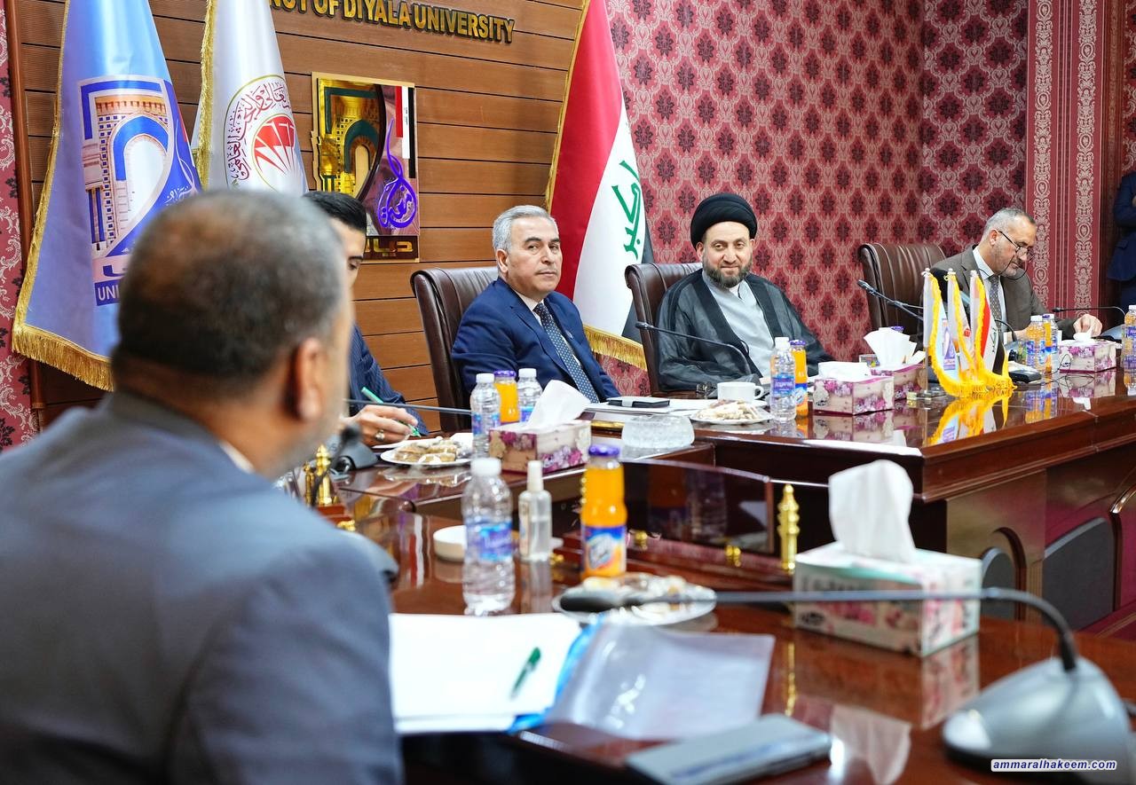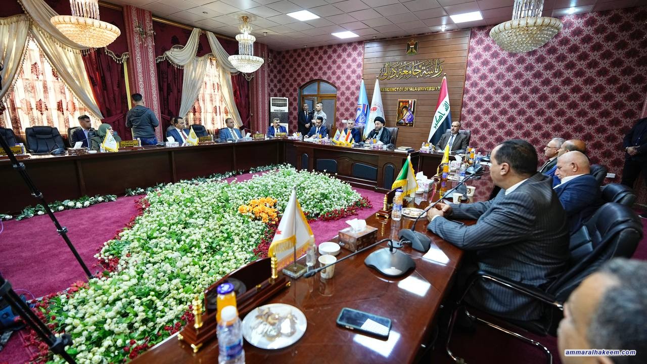 في محطته الثانية خلال زيارته لمحافظة ديالى التقى السيد عمار الحكيم رئيس تيار الحكمة الوطني مجلس جامعة ديالى بحضور الدكتور عبد المنعم عباس رئيس الجامعة ومساعديه العلمي والإداري و عمداء الكليات الاربعاء 1/3/2023، وأطلع على جهود الجامعة ومكانتها العلمية وخططها الطموحة على المستوى العلمي والإداري داعيا إلى إنشاء المركز الوطني للمواطنة والتعايش السلمي، مبينا أن ديالى عراق مصغر وحلقة وصل بين شماله وجنوبه ونقطة التقاء بين خمس محافظات تمتاز بالتنوع الجغرافي والديموغرافي، مجددا دعوته للوطنية الشيعية واعتماد المواطنة كمعيار لجميع أفراد المجتمع مؤكدا أن العراق ينهض ويتقدم وأن هناك كثيرا من المؤشرات التي تدل على ذلك ومنها بطولة خليجي ٢٥ وما ترتب عليها من إيجابيات، وكذلك مؤتمر البرلمانات العربية الذي امتاز بحضوره النوعي، مبينا أن هناك قراءة إيجابية للواقع العراقي لمن زار العراق مؤخرا.