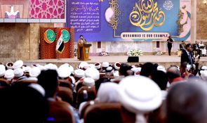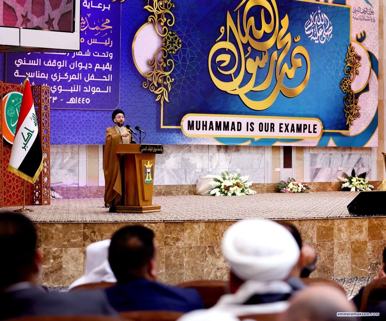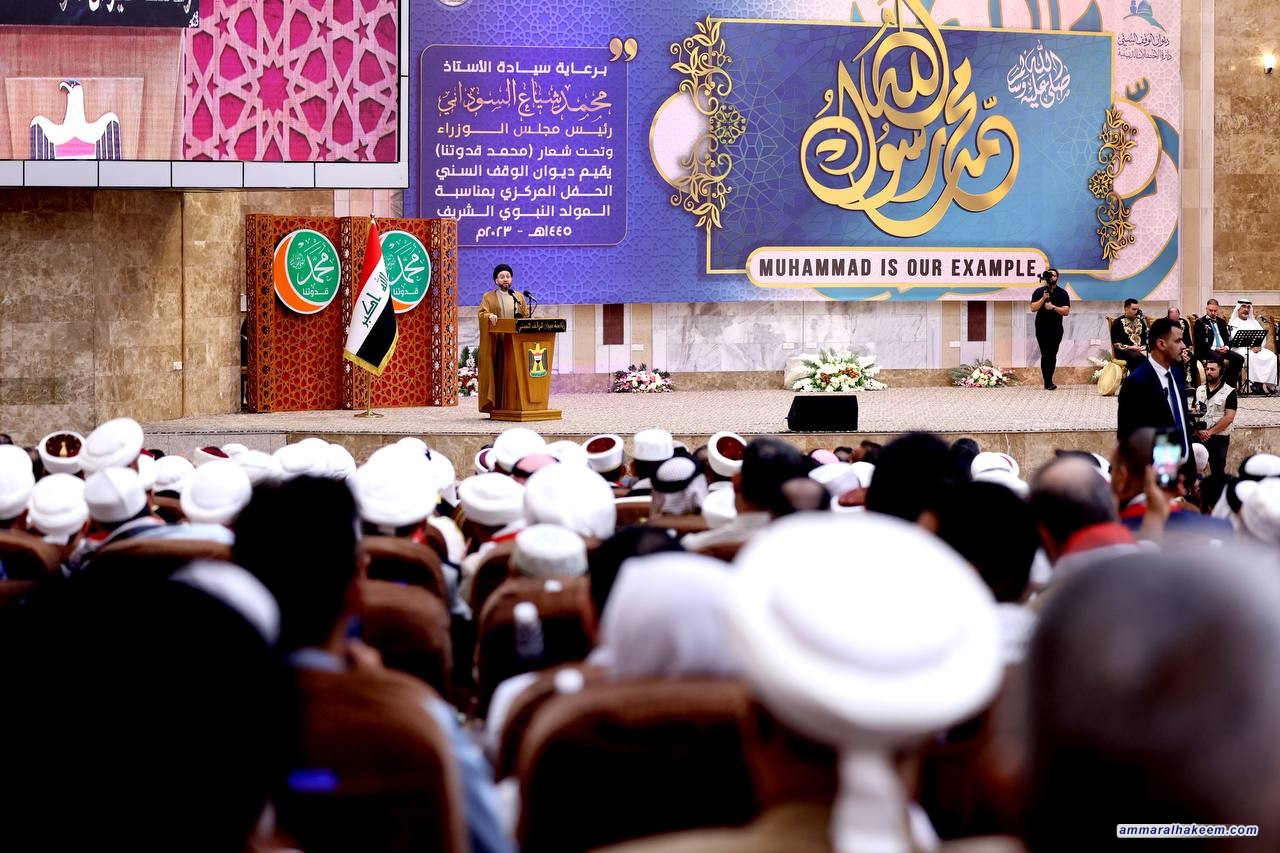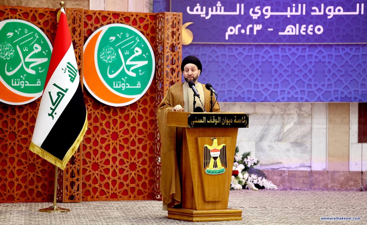 جدد السيد عمار الحكيم رئيس تيار الحكمة الوطني26/9/2023، خلال مشاركته في احتفالية ذكرى المولد النبوي الشريف الذي أقامه ديوان الوقف السني في بغداد، التبريك بمولد سيدنا ورسولنا الكريم محمد (صلى الله عليه وآله وسلم) مؤكدا أن الرسول محمد (صلى الله عليه وآله وسلم) هو خاتم النبيين وسيد المرسلين، وقد بلغ من الكمال الإنساني مالم يبلغه بشر، وكانت رسالته أعظم الرسالات وخاتمتها.