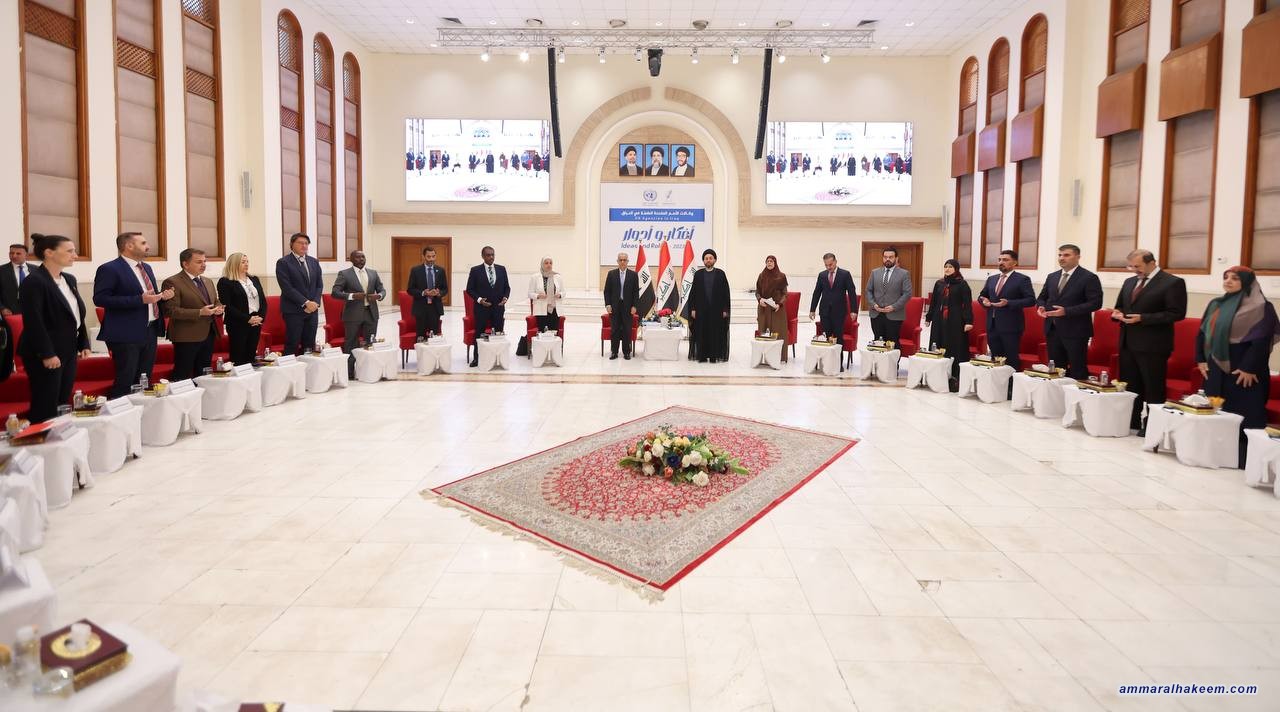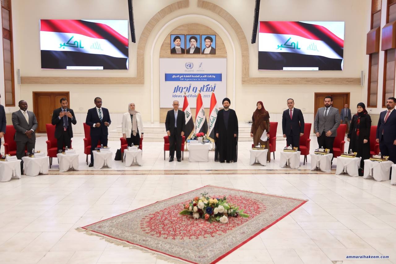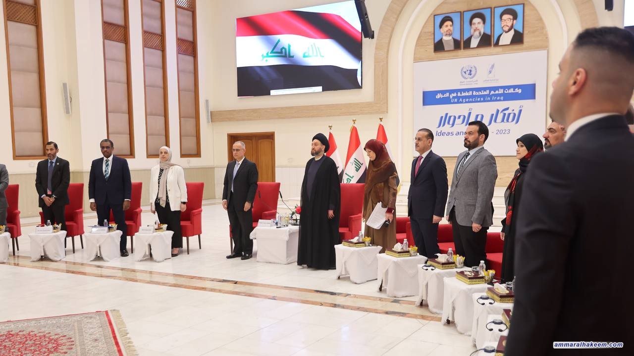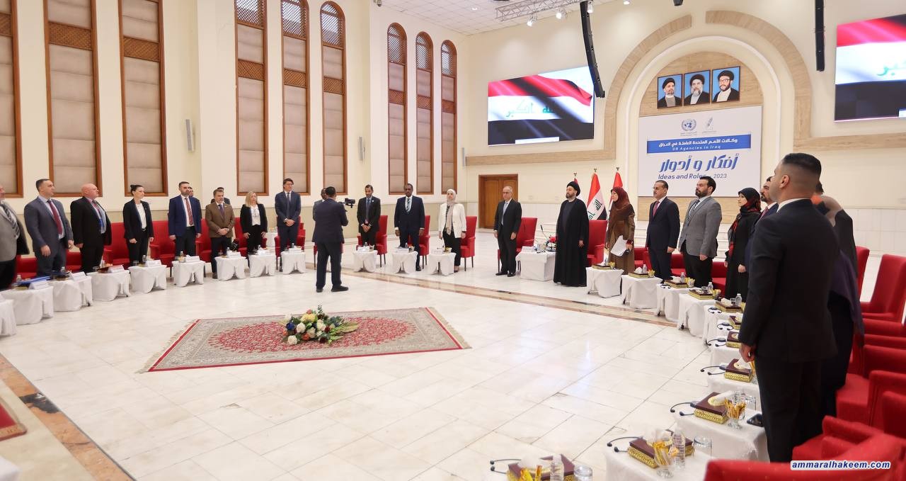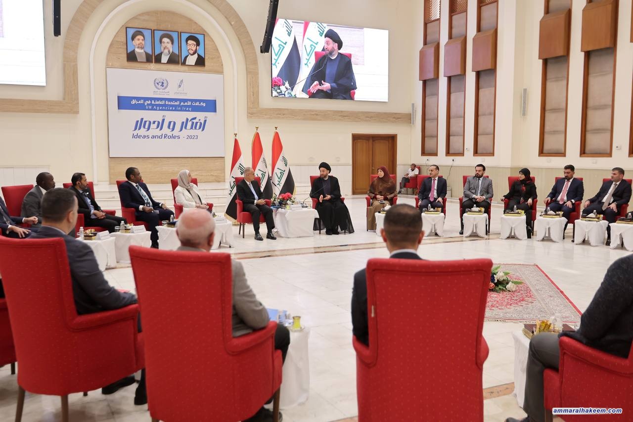 السيد الحكيم أكد أيضا أهمية مكافحة الفساد ونعتقد أن الحديث عن الفساد أكبر من الفساد نفسه، مشددا على إصلاح النظام المصرفي كشرط أساس لتحقيق النهضة التنموية، محذرات من المخدرات، داعيا لمعالجتها والتعامل معها كتحد أخطر من الإرهاب، وضرورة إدامة معالجة الفكر المتطرف وإعادة النازحين واستكمال التشريعات اللازمة للنظام السياسي، سماحته دعا للمساعدة في اعتماد التجارب المشابهة في الأنظمة الفيدرالية عند الحديث عن الثروات وكيفية توزيعها وإدارتها، كما أشار إلى ضرورة إزالة النزاعات الحدودية مع دول الجوار عبر الحوار واعتماد مبدأ حسن الجوار، كما اقترح إنشاء صندوق مشترك بين وكالات الأمم المتحدة والحكومة العراقية لإدارة ملف التمويل في فترة انتقالية متفق عليها، محذرا من رفع الدعم دفعة واحدة عن العراق، وشدد على ضرورة أن يكرس الدعم لتطوير المؤسسات وتمكينها من مواكبة التطور الإداري والتكنولوجي، في حين أشار إلى ضرورة التكاملية بين وكالات الأمم المتحدة والحكومة العراقية خدمة للشعب العراقي.