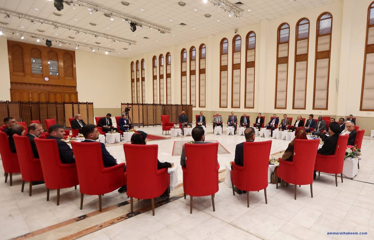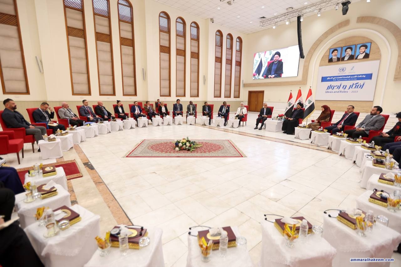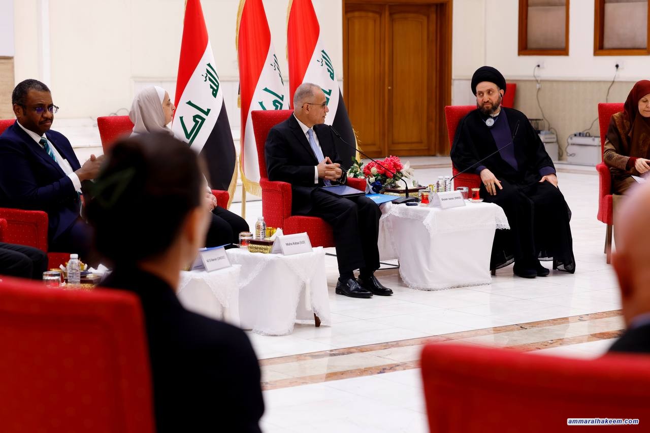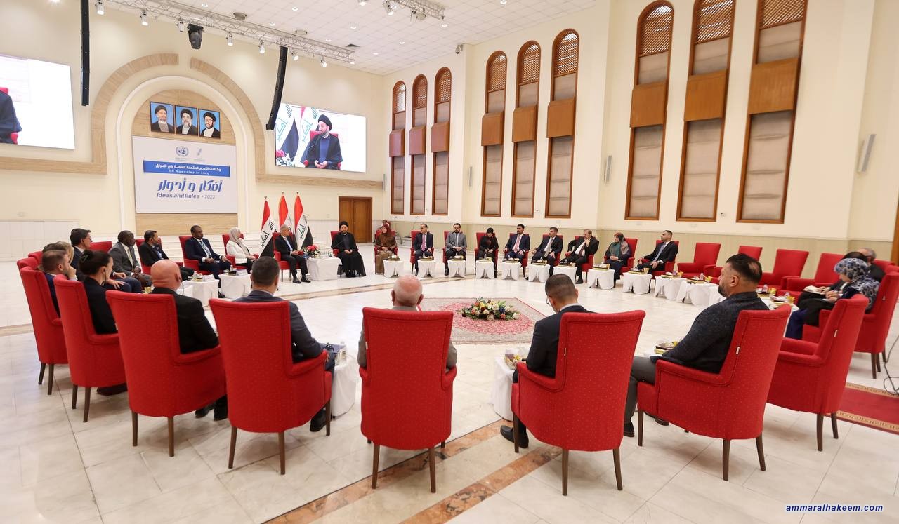 سماحته أشار إلى طبيعة المجتمع العراقي ونسبة الشباب المتقدمة فيه، مؤكدا أن تيار الحكمة الوطني تشكل ليكون معبرا عن همومهم وتطلعاتهم حيث مكنهم في مؤسسات الدولة وتبوأوا مناصب عليا في التيار على مستوى المكتب السياسي وباقي المؤسسات، مشيرا إلى تجربة مؤسسة الحكيم الدولية وما قدمته من خدمات إنسانية وتعليمية عبر المدارس والمعاهد المتوفرة.