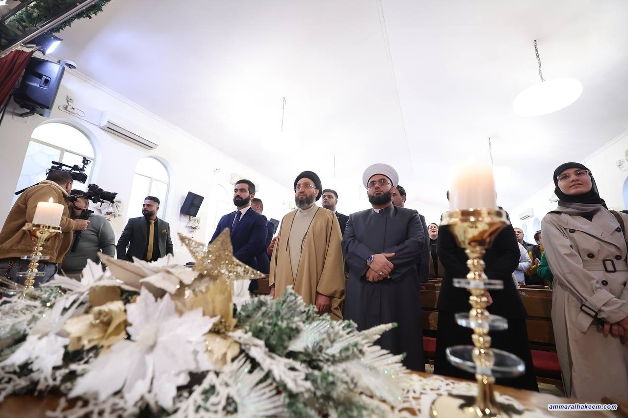 وأضاف السيد الحكيم: "العراق يعيش اليوم حالة تنموية كبيرة، ويتطلب ذلك مراكمة الإيجابيات لبناء عراق مستقل ومستقر ومزدهر، وهو ما يمكن تحقيقه من خلال احترام الخصوصيات تحت خيمة العراق". واعتبر أن "حضورنا في الكنائس اليوم هو تعبير عن الروابط الإنسانية بين أبناء الشعب العراقي، كما أن المسيحيين في العراق هم مكون لا يقاس بعدده، بل بدوره النوعي وإسهاماته في إثراء المجتمع".