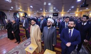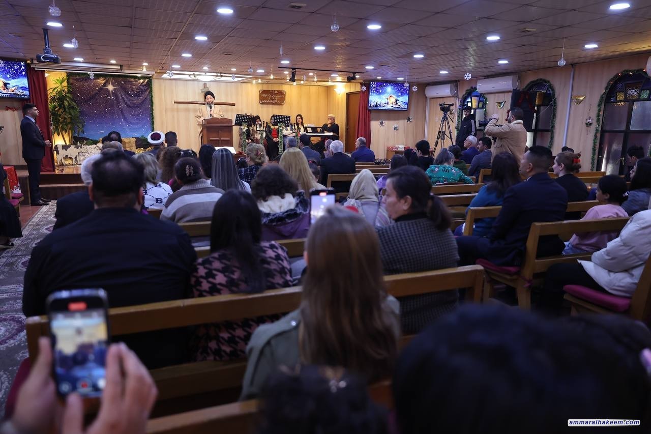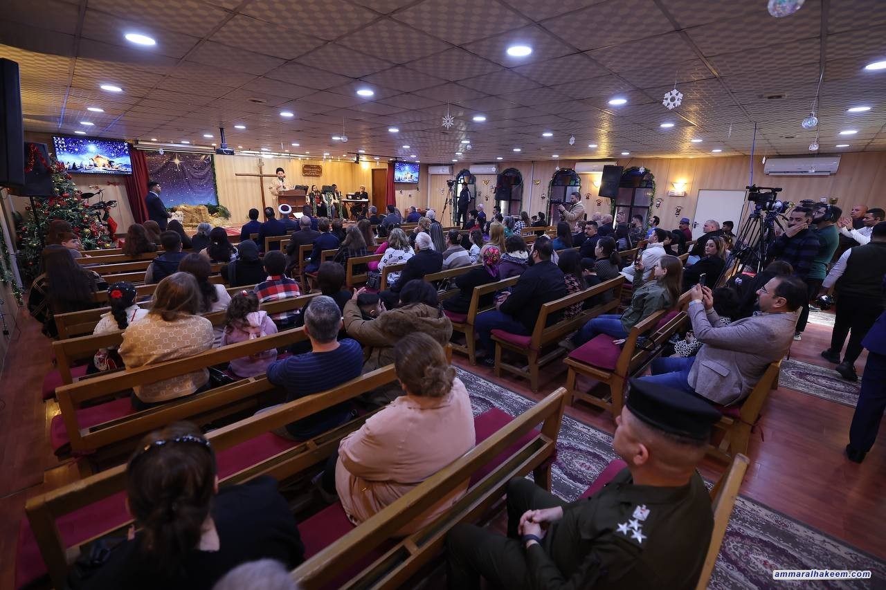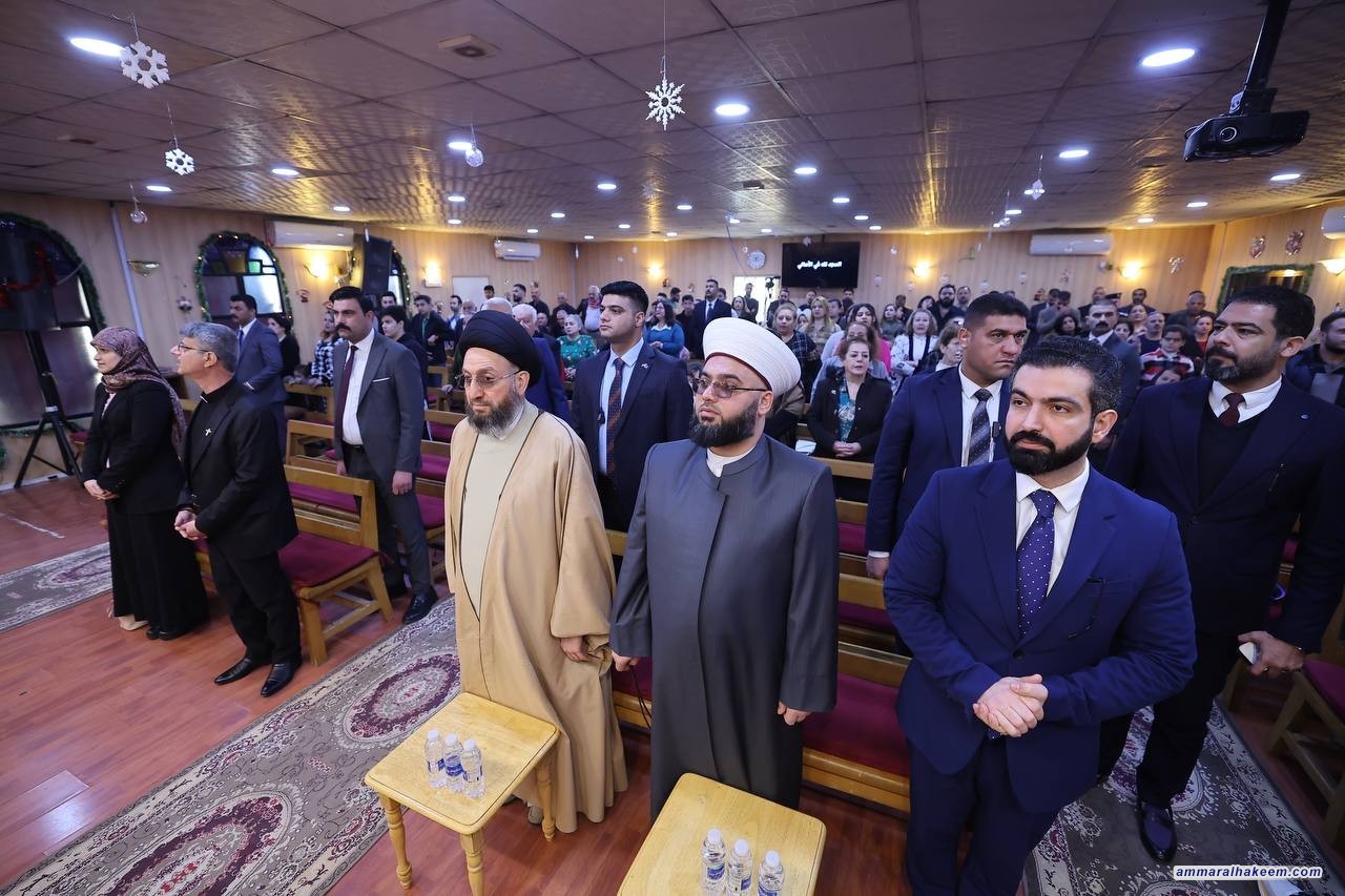 من الكنيسة المعمدانية الإنجيلية الوطنية في منطقة الكرادة، جدد السيد عمار الحكيم، رئيس تحالف قوى الدولة الوطنية، مباركته للإخوة المسيحيين بمناسبة عيد الميلاد المجيد، مؤكدا أن "وجودنا في الكنائس هذا اليوم جاء لإطلاق رسائل التضامن والمحبة للإخوة المسيحيين"، مشيرًا إلى أن "الطوائف مصدر إثراء لواقعنا المعرفي والاجتماعي"، وأن "هذا التنوع هو محط فخر وقوة للمجتمع العراقي، وقد حوله إلى أمة عراقية تحت خيمة العراق".