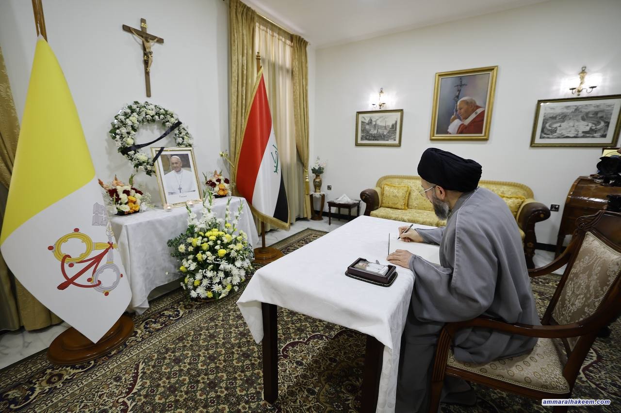 واستذكر السيد الحكيم زيارة قداسة البابا الراحل إلى العراق، والتي استمرت لأربعة أيام وشكّلت محطة بارزة في تاريخ التعايش السلمي بين المكونات الدينية والاجتماعية في البلاد، لا سيما لقاؤه التاريخي بسماحة المرجع الأعلى الإمام السيد علي السيستاني (دام ظله الوارف)، والذي عكس عمق القيم المشتركة بين الأديان.