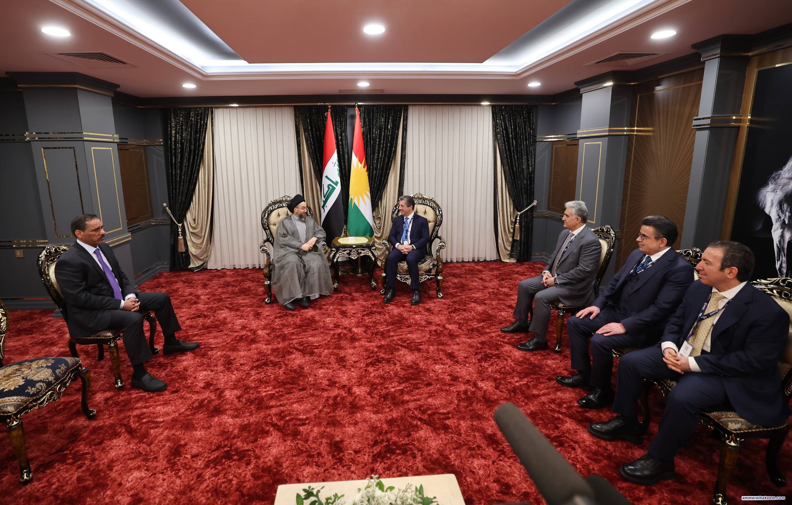على هامش أعمال المنتدى السادس للسلام والأمن في الشرق الأوسط في محافظة دهوك، التقى سماحة السيد الحكيم، رئيس تحالف قوى الدولة الوطنية، بفخامة الرئيس مسعود بارزاني، والأستاذ نيجرفان بارزاني، رئيس إقليم كردستان العراق، والأستاذ مسرور بارزاني رئيس حكومة الإقليم، حيث جرى تبادل التهاني بنجاح الانتخابات البرلمانية الأخيرة، والصورة الوضاءة التي قدّمها الشعب العراقي في كل مكان عن تجربته الديمقراطية، وتمسّكه بالاحتكام لصندوق الاقتراع لتحديد ممثليه.