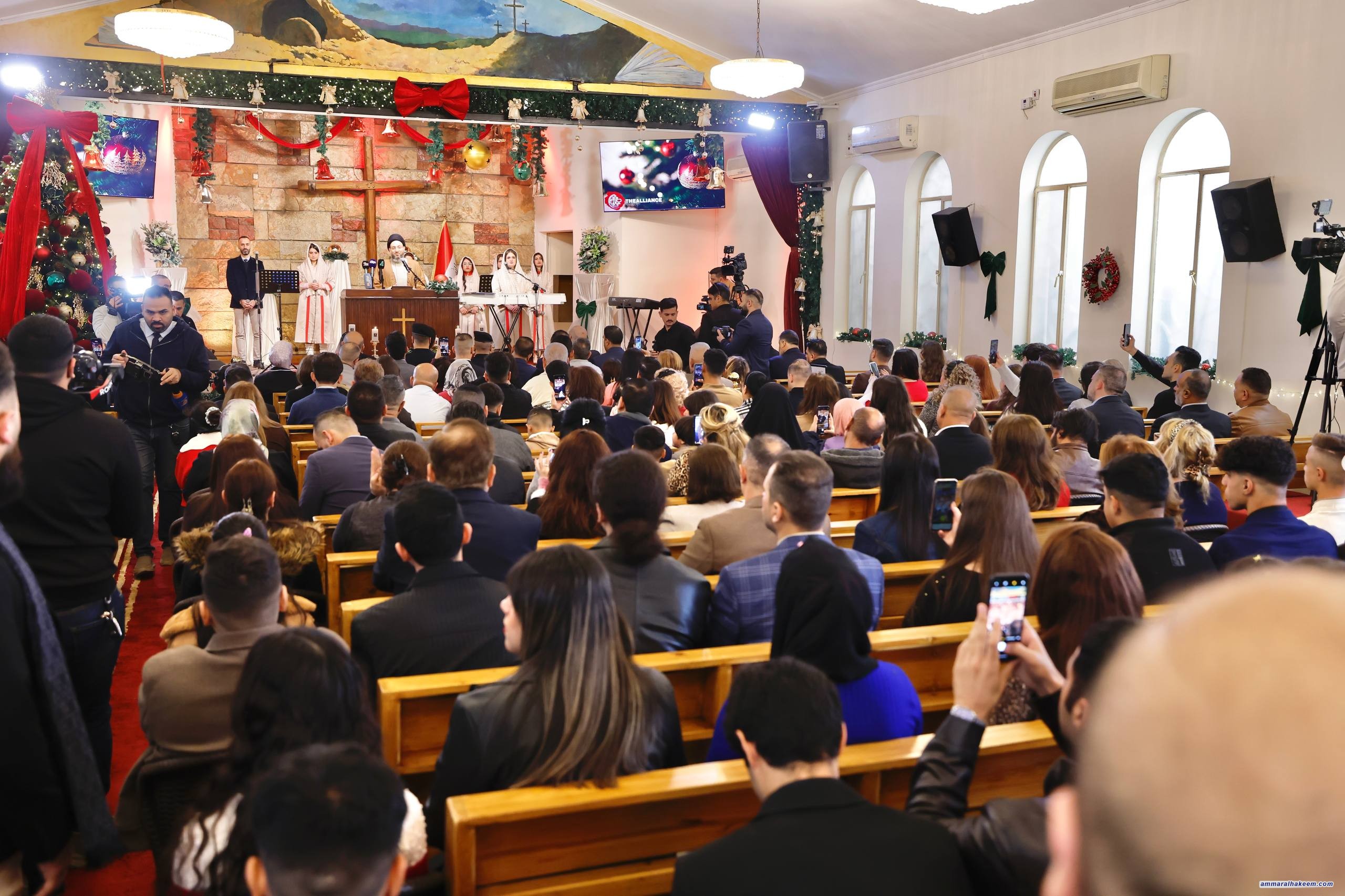 من كنيسة الاتحاد المسيحي الإنجيلية الوطنية، شارك سماحة السيد الحكيم، رئيس تحالف قوى الدولة الوطنية، الإخوةَ المسيحيين احتفالاتِهم بعيد الميلاد المجيد، حيث بارك لهم هذه المناسبة الطيبة، معربًا عن اعتزازه بالتنوّع الديني والثقافي الذي يميّز المجتمع العراقي.